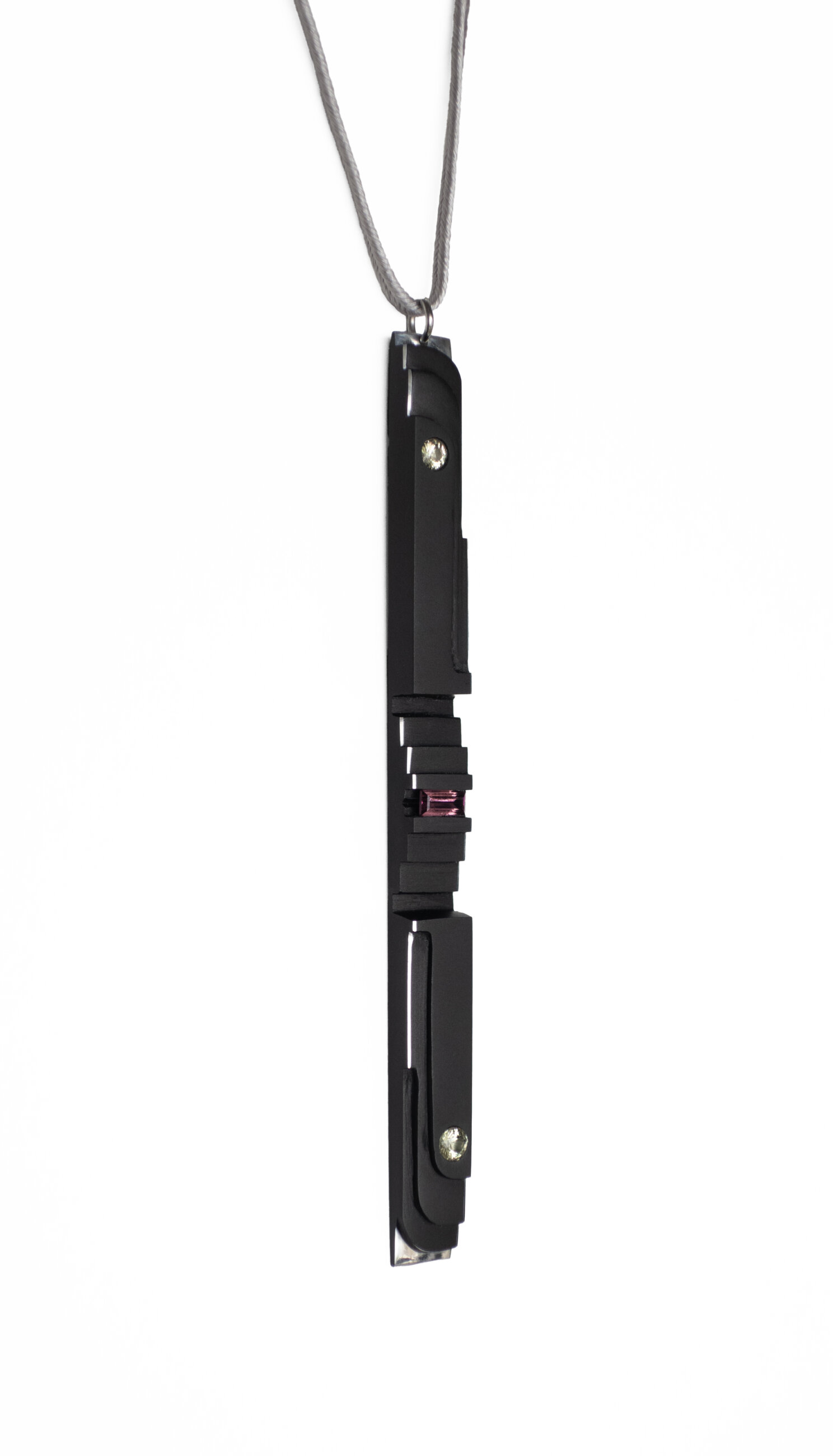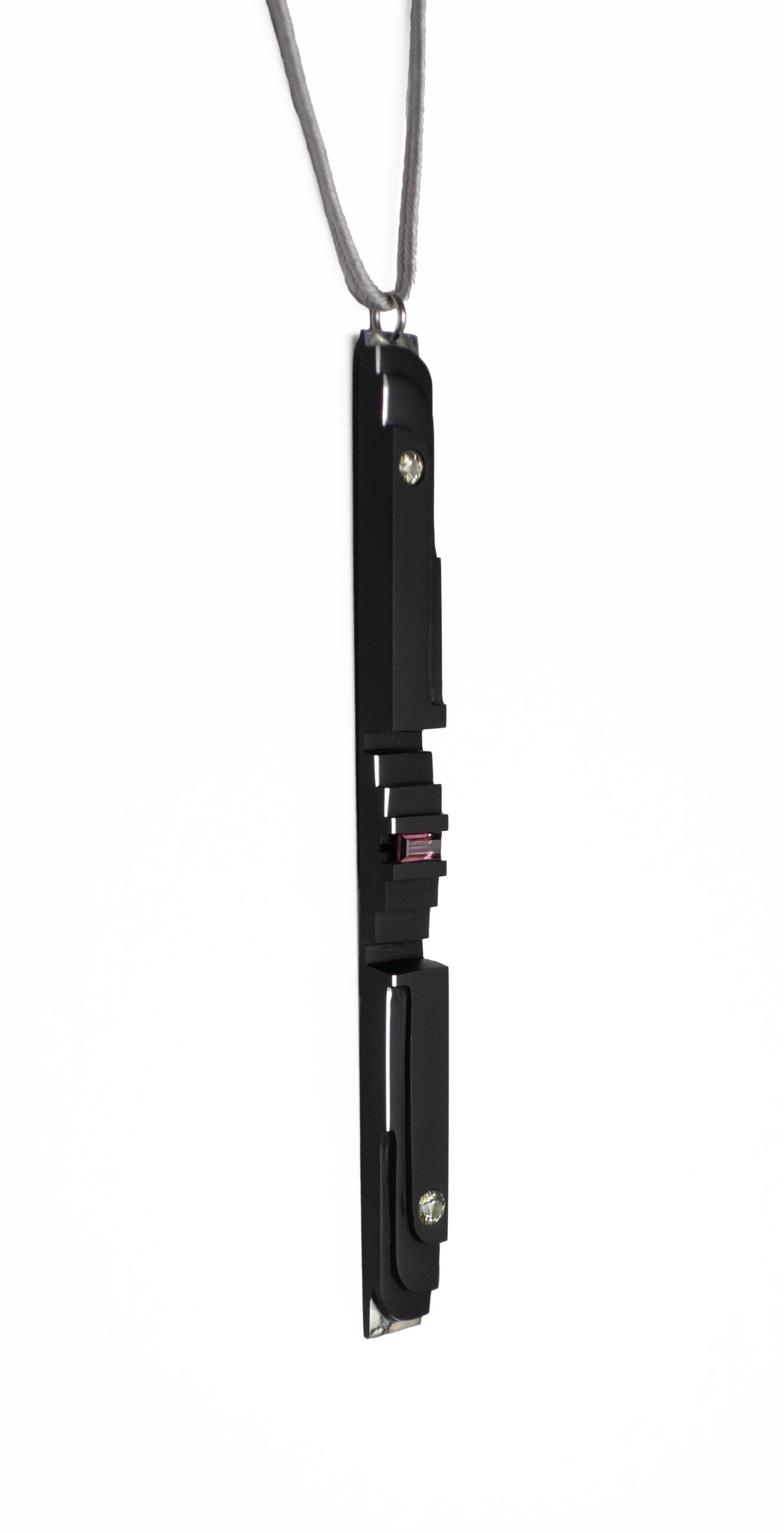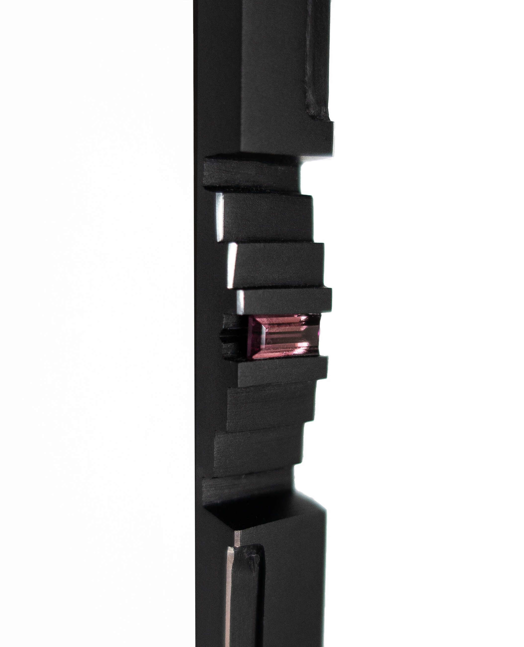 This pendant in black anodised and polished aluminium evokes the Art Deco style, with its interlocking geometric shapes. The elongated graphic shapes flow into one another: rounded and rectangular steps punctuated with stones that illuminate the whole. Two chrysoberyls (0.58 ct) and a pink tourmaline (0.4 ct).