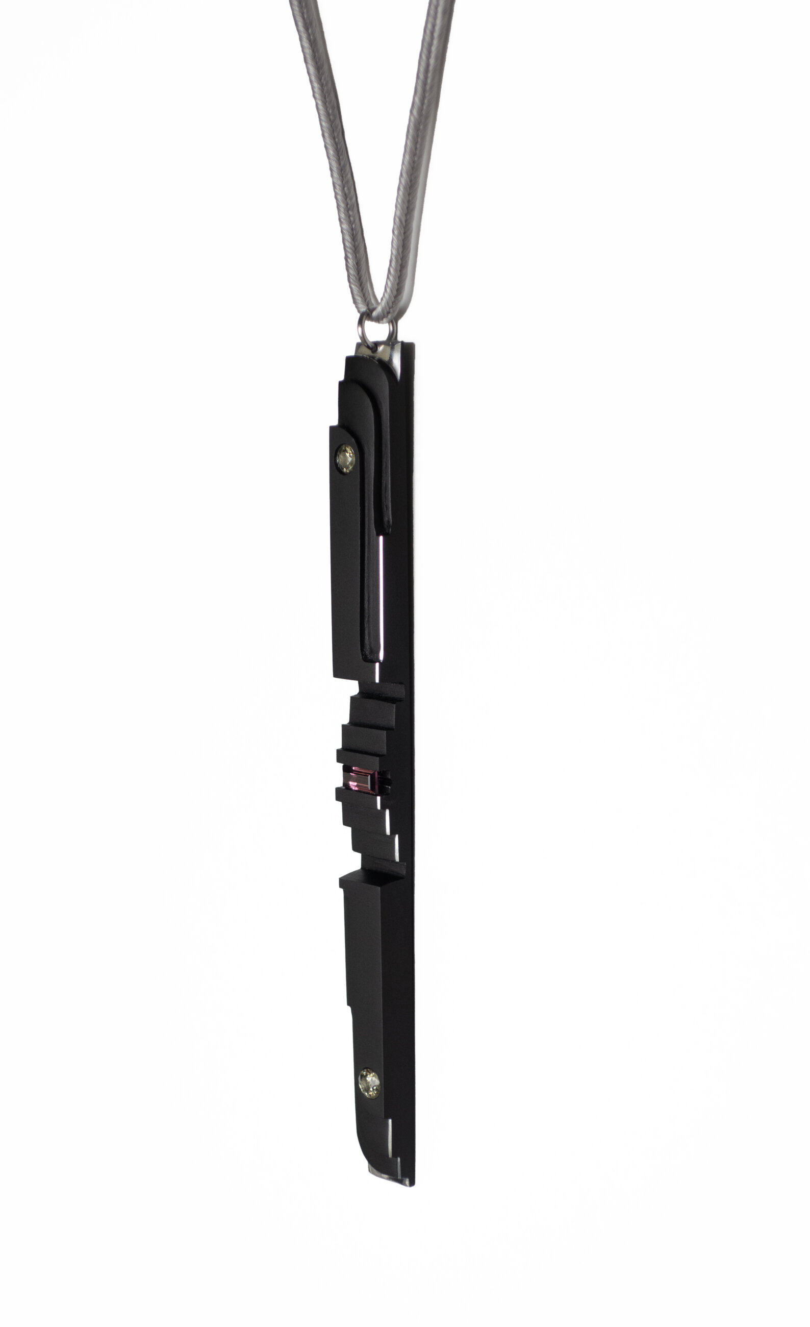 Ce pendentif en aluminium anodisé noir et poli évoque le style Art déco, dont il reprend les formes géométriques qui s’imbriquent les unes dans les autres. Tout en longueur, les formes graphiques s’enchainent : escaliers arrondis et rectangulaires ponctués de pierres qui viennent illuminer l’ensemble. Deux chrysobéryls (0,58 ct) et une tourmaline rose (0,4 ct).