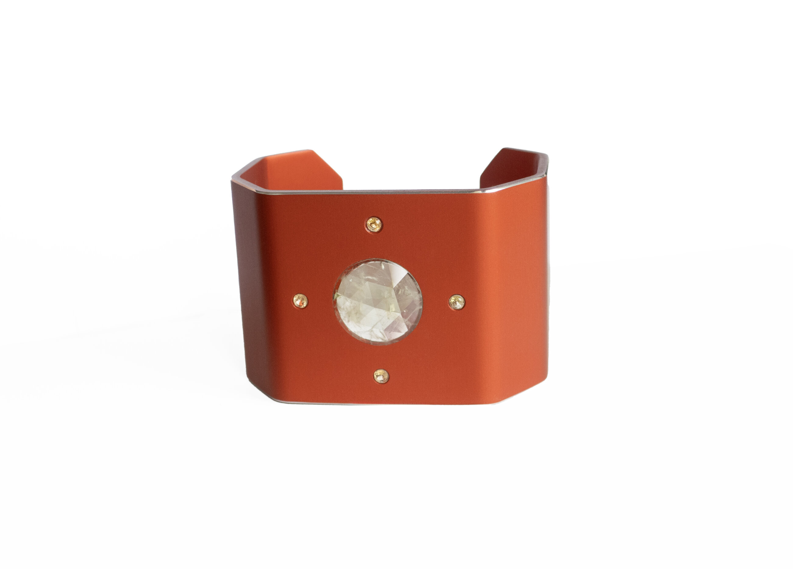 Made from aluminium, sandblasted and polished by hand, the cuff is also anodised in an elegant coppery red. The piece is enhanced by a 6.5 ct rose-cut prehnite with delicate green hues and four small yellow tourmalines (0.4 ct) that illuminate the whole.