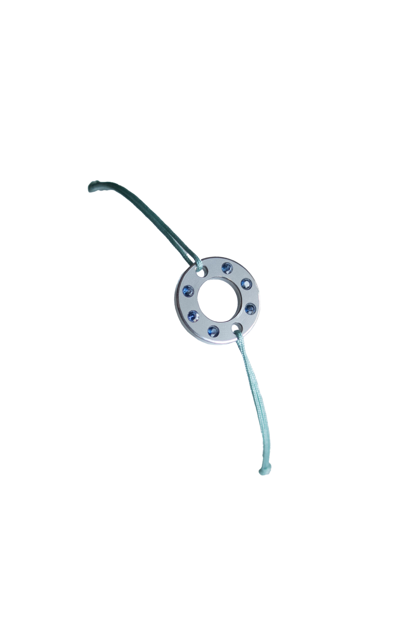 This Ready-Made bracelet, small model, is crafted from a silver anodised aluminium washer with holes, originally used for fastenings on racing motorcycles. Repurposed as jewellery, the washer is hand-polished and encrusted with six blue sapphires (0.3 ct) to create delicate colour contrasts. An adjustable blue waxed cotton cord secures the bracelet around the wrist.