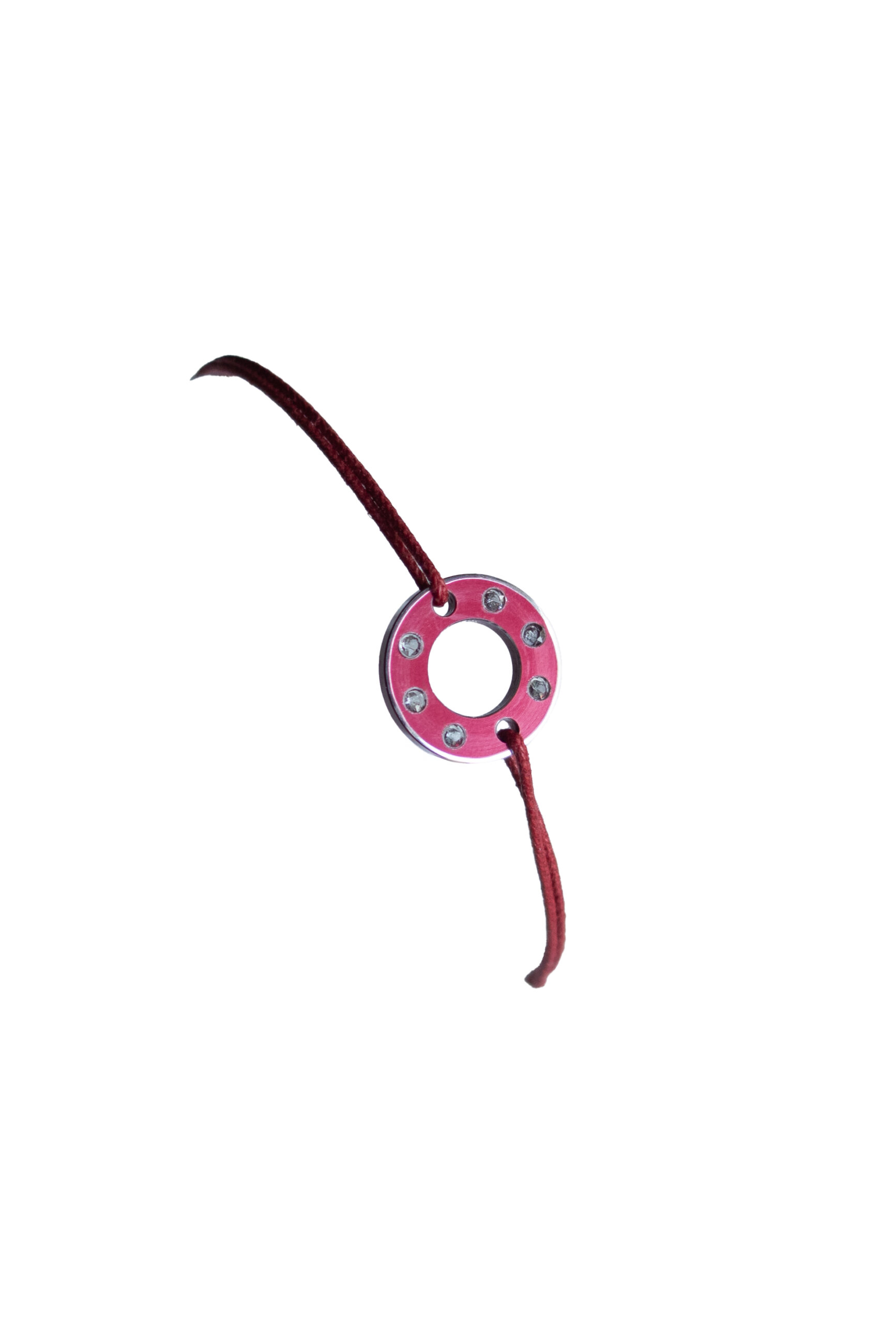 This Ready-Made bracelet, small model, is crafted from a red anodised aluminium washer with holes, originally used for fastenings on racing motorcycles. Repurposed as jewellery, the washer is hand-polished and encrusted with six aquamarines (0.18 ct) to create delicate colour contrasts. An adjustable red waxed cotton cord secures the bracelet around the wrist.